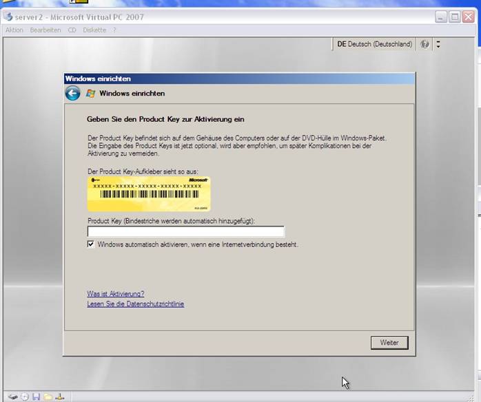 Windows Vista oder Server 2008 wurden bei einem Händler erworben, Lizenzschlüssel liegt dem Produkt bei